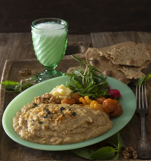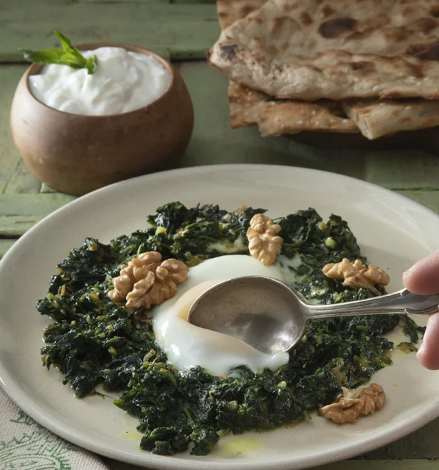 Serve the Spinach Nargessi with Sangak bread and Kefir/Labneh. 1. To garnish, add some chopped walnuts on it. 2. Garlic is optional; it adds a...