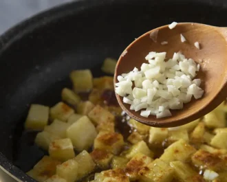 Add the shrimps to the potatoes and then the onions, stir and fry for about 3 minutes. Then pour 1/4 cup of water and reduce the heat until the potatoes are soft and the food released some oil. After 8 minutes, the double onion shrimp dish is ready to serve with rice or bread.