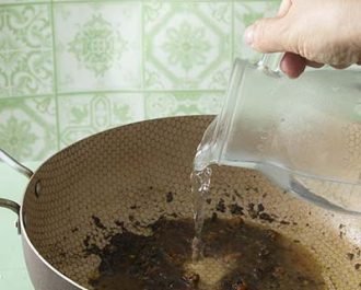 Take out about two-thirds of the ingredients in the pan and add 1 glass of hot water to the remaining contents.
