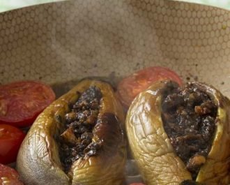 Place the fried eggplants on the cutting board, make a longitudinal cut in the middle and stuff with the two-thirds of the prepared ingredients (in step 3). Then place them in the remaining sauce in the pan. Place the fried tomatoes next to them and cover. This thick sauce and the stuffed eggplants should simmer on low heat. After 15 minutes, serve it.